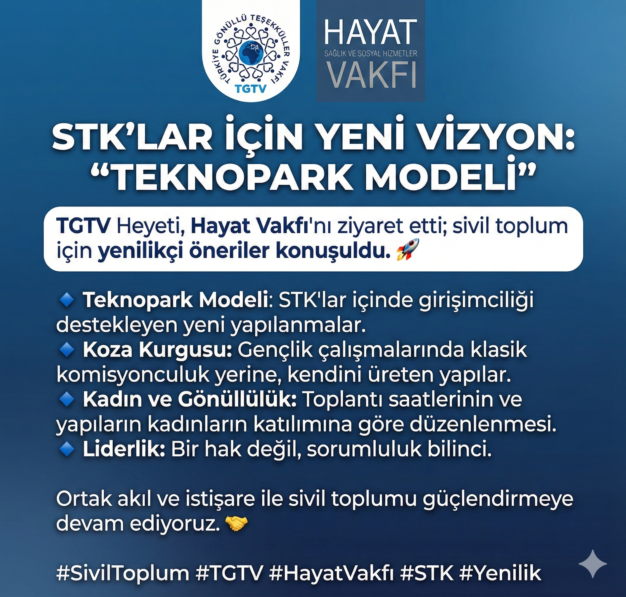 Yeni Yapılanma: TGTV İstanbul dışında da teşkilatlanmalıdır. Ayrıca STK’lar için "Teknopark" benzeri bir yapılanma modeli geliştirilmelidir.